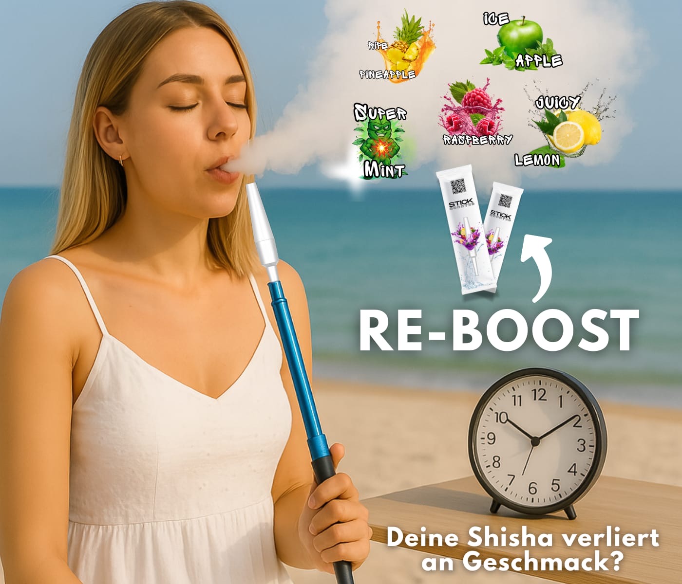 RE-BOOST ist deine perfekte Lösung, wenn deine Shisha mit der Zeit den Geschmack verliert. Einfach deinen neuen Lieblingsgeschmack mit dem StickBooster aufsetzen und das volle Aroma genießen.