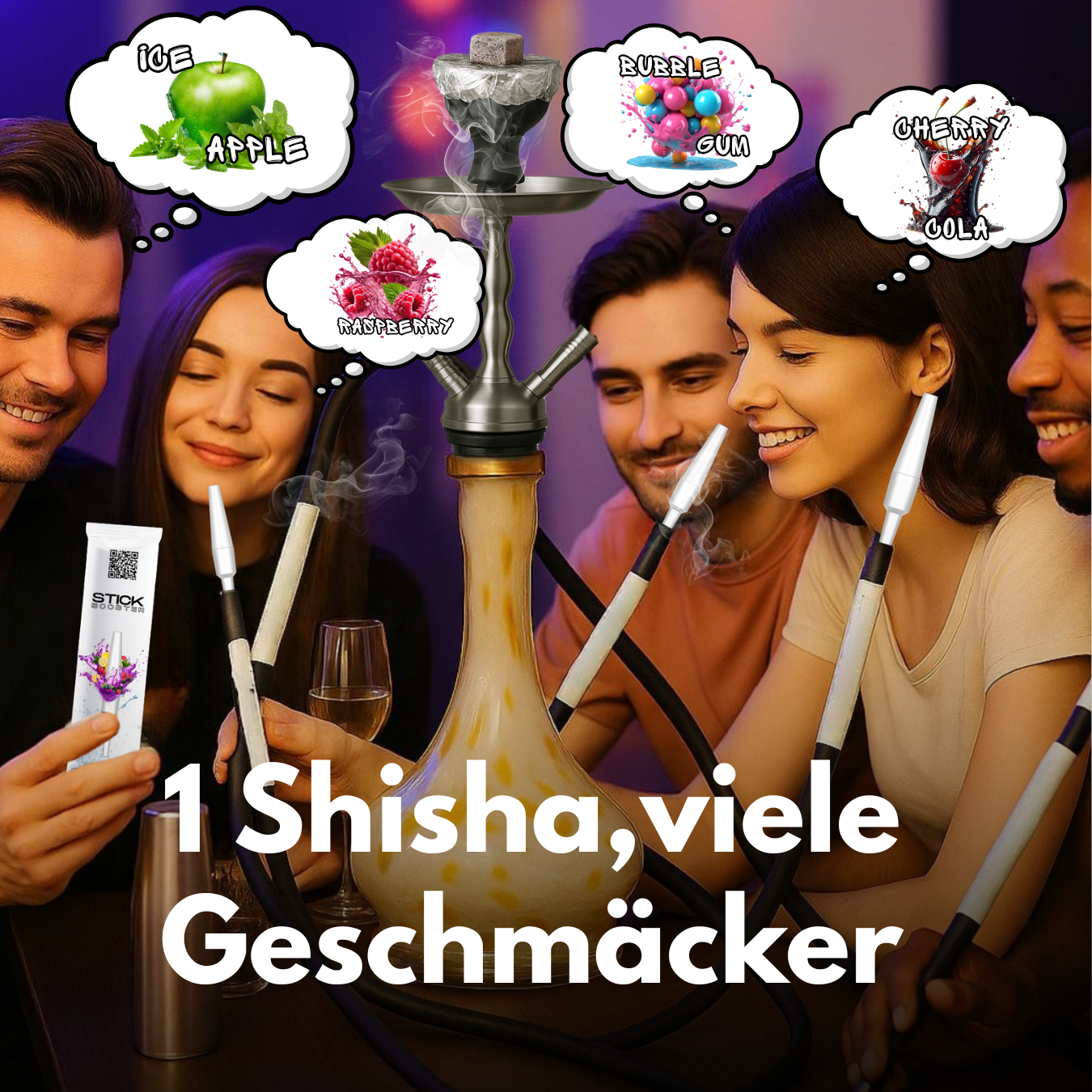 Genieße deine Shisha mit vielen Geschmäckern zusammen mit deinen Freunden. Jeder mit seinem Stick Booster LieblingsGeschmack in der Hand. Unser Motto, eine Shisha, viele Genüsse!